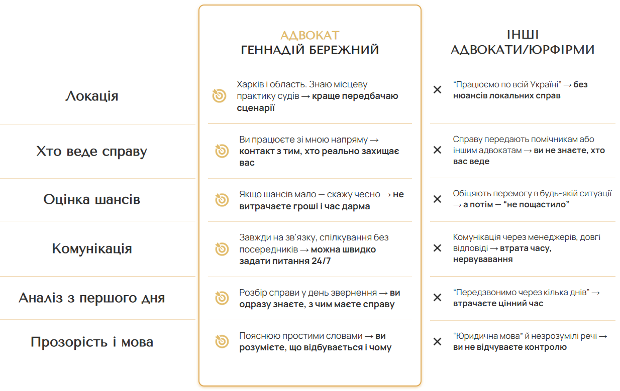 ✔ Пропоную тактику, яка враховує практику судів і реальні шанси, а не красиві обіцянки
